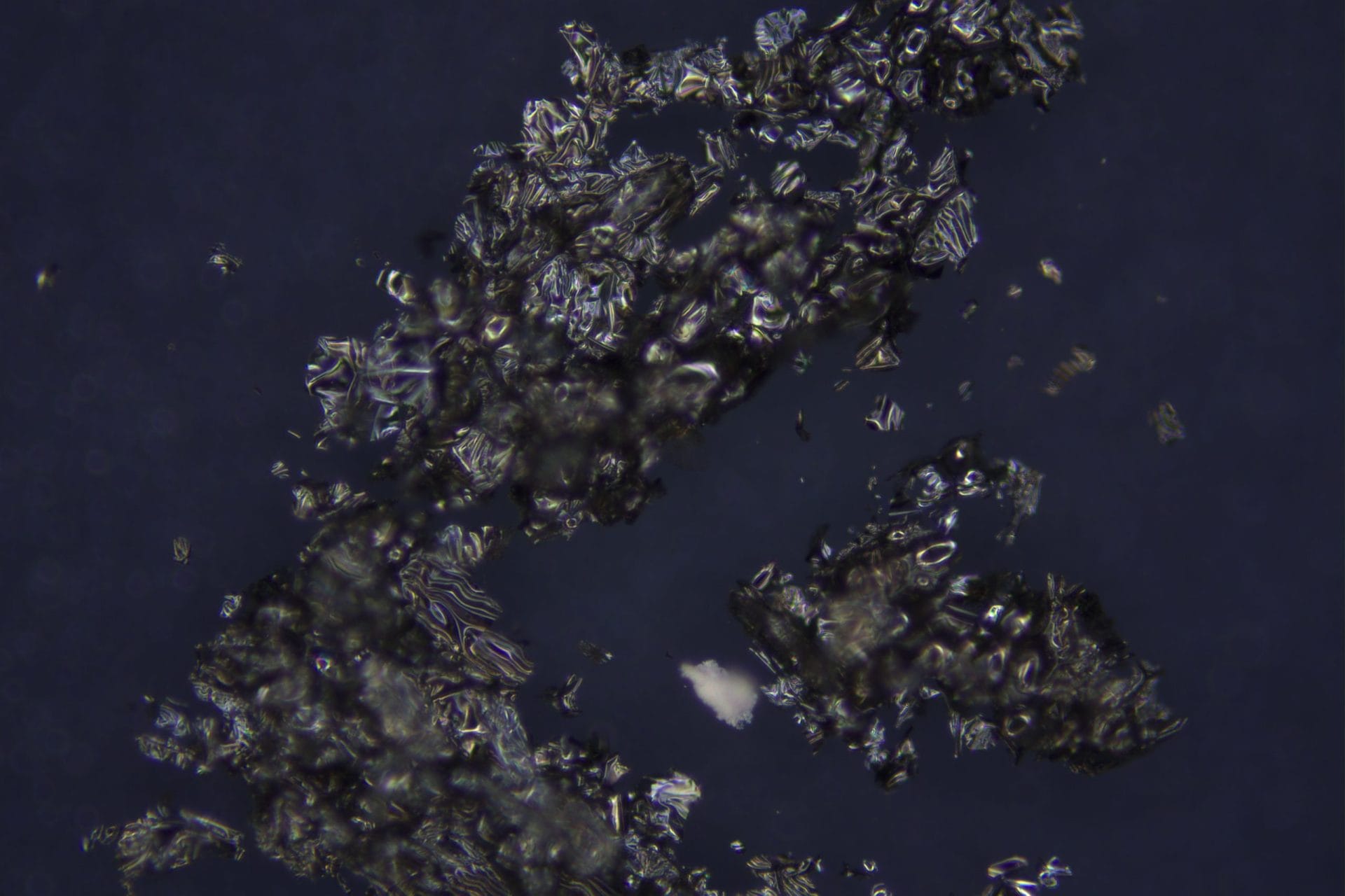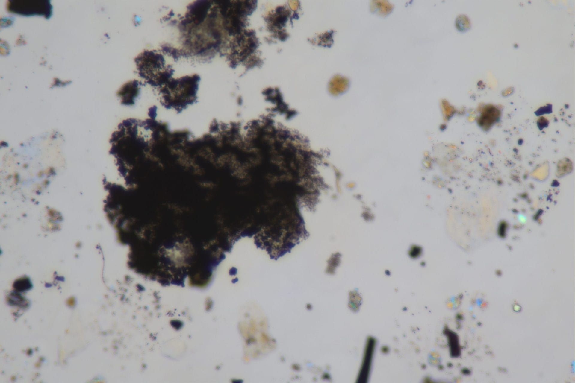Photomicrograph of tapelift sample showing Soot Clusters particles in transmited polarised light mode. See end of page for more photomicrographs.