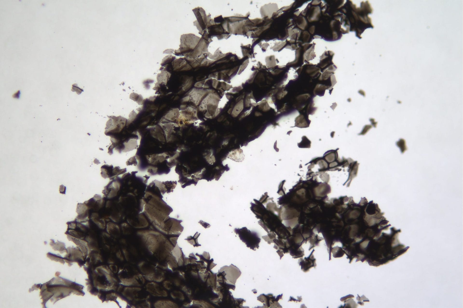 Photomicrograph of tapelift sample showing char particles in transmited light mode. See end of page for more photomicrographs.